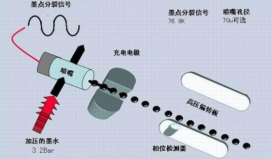 如今的油墨噴碼機類型眾多,但噴印原理都是相同的,都是在一定的壓力下,墨水經噴槍組件小孔射出構成墨線,經過振蕩電路使墨線分裂成大小和距離相等的墨點,墨點在經過充電極時會被充上電,并在電場力的效果下產生偏轉構成圖像。