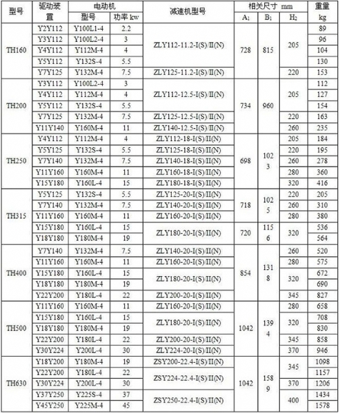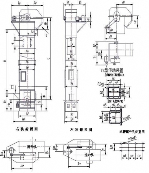 該斗式提升機傳動裝置有二種形式,分別配有ZJ型減速器和ZQ型減速器。ZJ型軸裝減速器直接套裝在主軸軸頭上,省去了提升機傳動平臺、聯軸器等,使TH型斗式提升機結構緊湊、重量輕,而且內部帶有異型輥逆止器,逆止可靠,該減速器噪聲低,運轉平穩,并隨主軸浮動,可消除安裝應力。本機輸送量365m3/h,提升高度為50m。